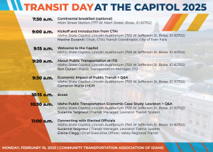 CTAI hosted the 2025 Transit Day at the Idaho Capitol on Monday, February 10. This special event brought together leaders, advocates, and stakeholders to explore the vital role transit plays in Idaho’s communities and economy. A video recording of the event and event materials can be found below.